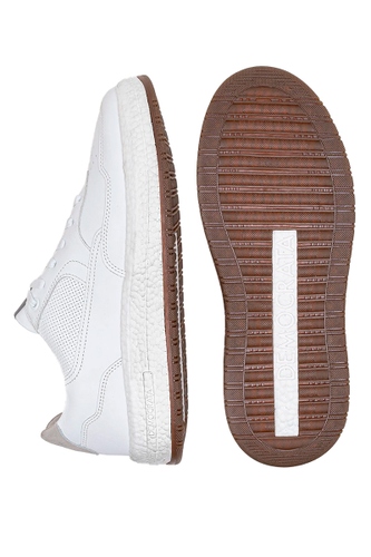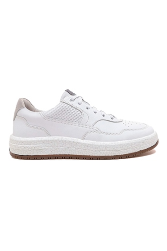 Confeccionado em couro na cor branco, fechamento de cadarço de amarrar, contém detalhes perfurado e em pesponto no couro. O bico é arredondado e a palmilha é feita de P.U.